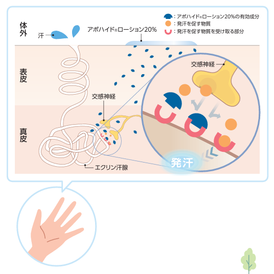 手のひらの皮膚から吸収され、交感神経から放出される発汗を促す物質の働きを抑えることで、過剰な発汗を抑制します。