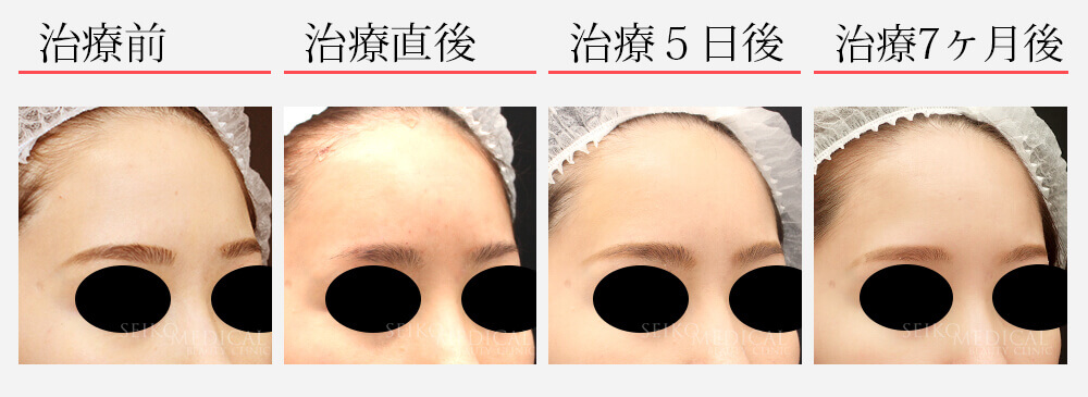 - 通常は注入部位は、おでこの見えるところではないので、おでこには、傷はありません。