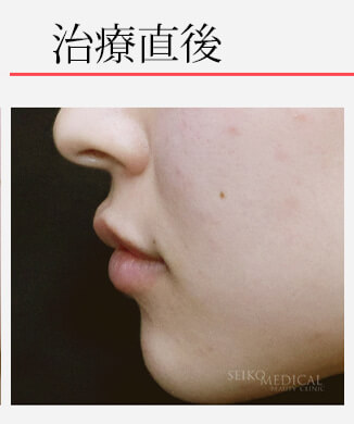治療直後の状態です。人中や、赤唇縁は元々はっきりしていましたので、下の丸印の部分に注入し、M字型のリップにしています。