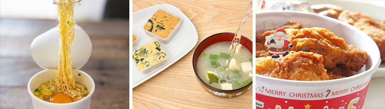 ハンバーガー、ホットドッグ、フライドチキン、ピザ、カップラーメンなど